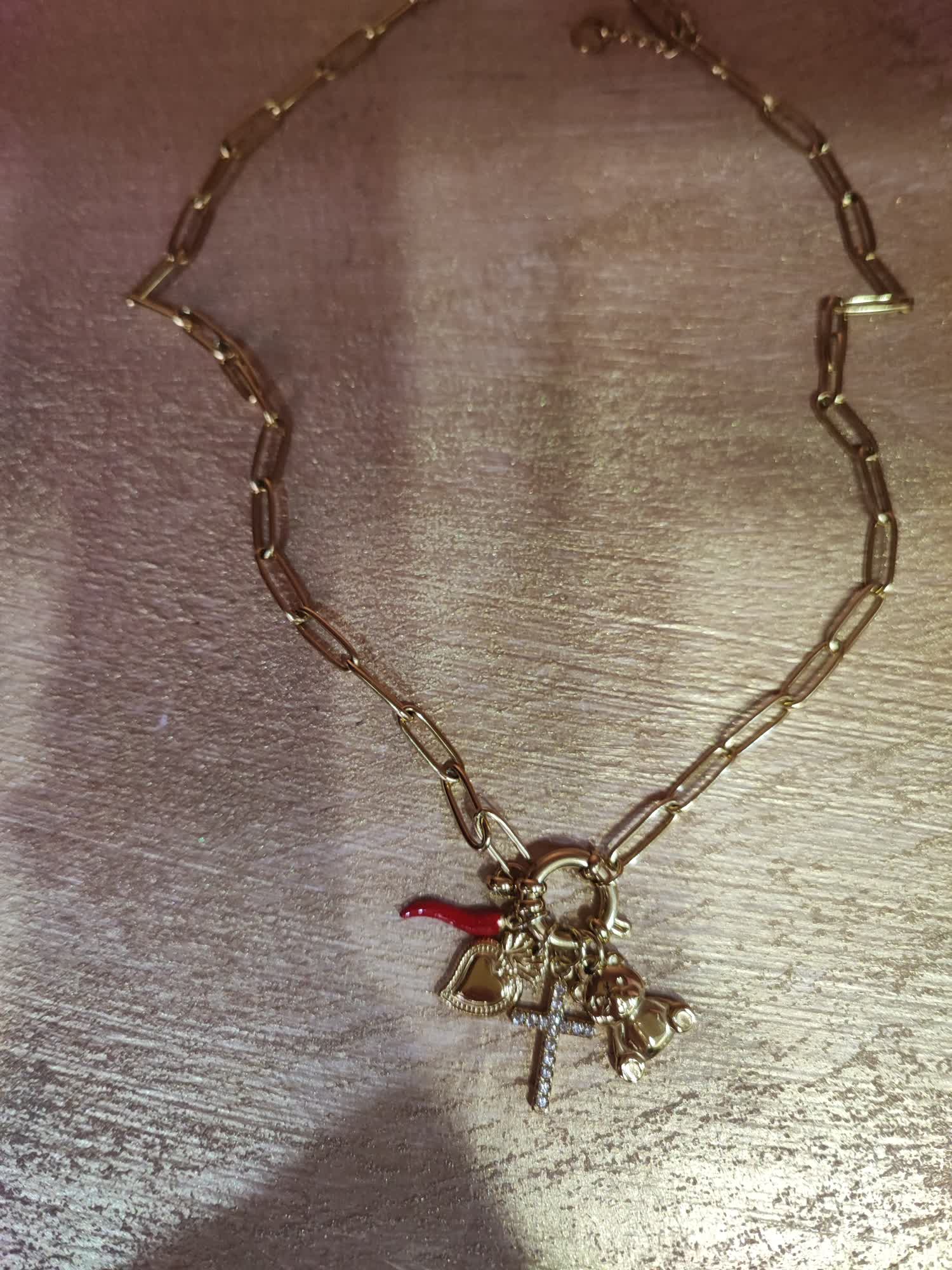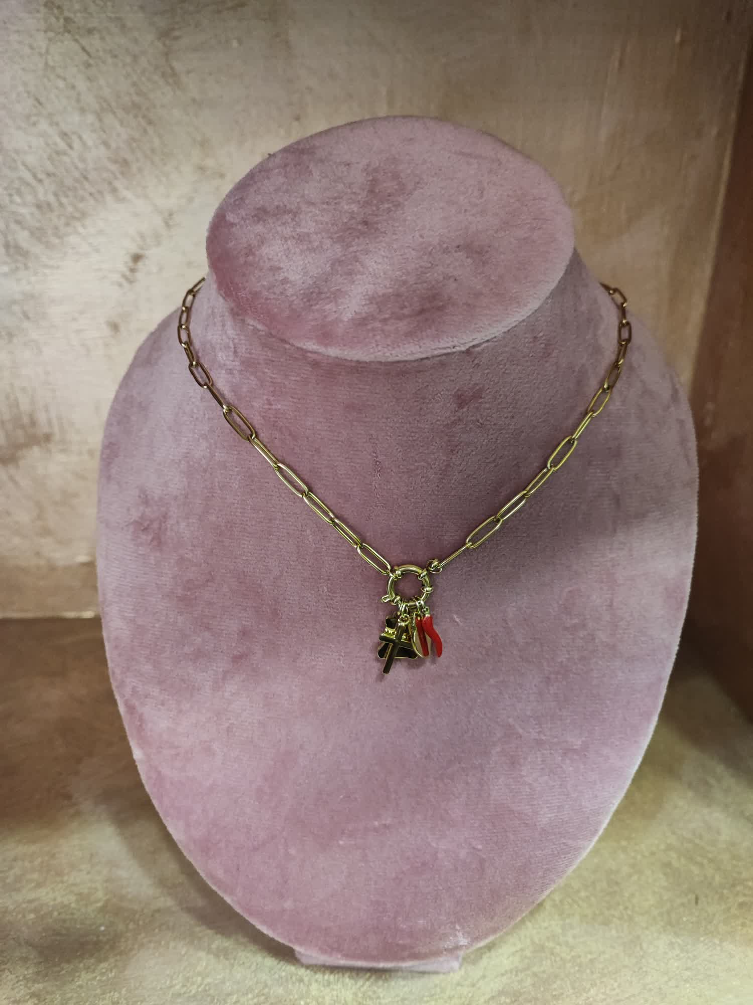 Collana in accaio inox con orsetto cuore,croce con brillantini e cornino rosso modello regolabile